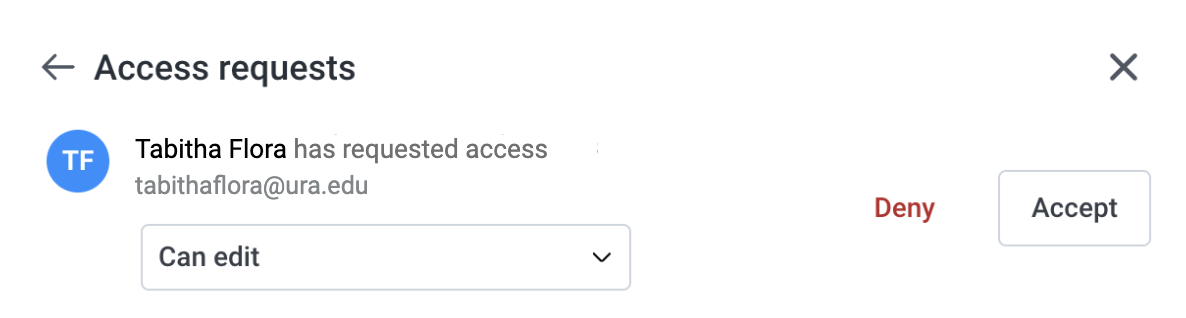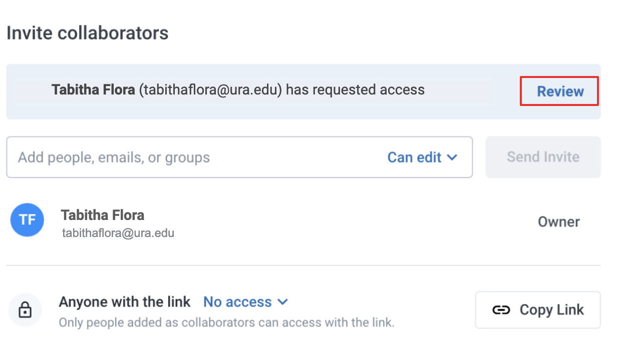 When someone requests access, the file owner will receive an email titled “Review Request”. Clicking this opens the access management panel.