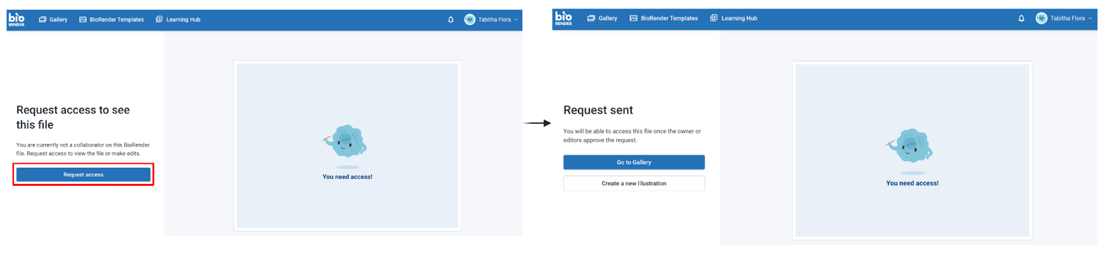 If a collaborator shares an illustration with you but you can’t access it, BioRender offers a streamlined access request process. This ensures file owners maintain control while collaborators enjoy an intuitive and secure way to request file access.