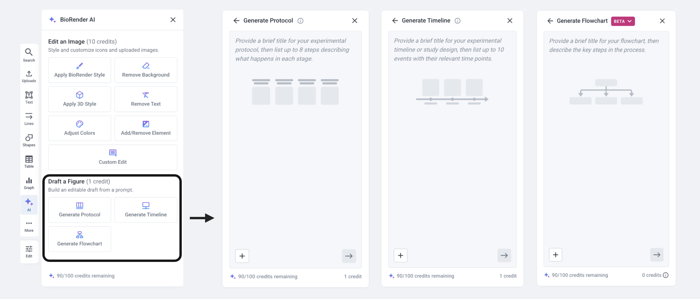 Please note: These features are available for Premium users who have opted in to the new BioRender Canvas. Click here to learn more about opting in. While AI-generated protocols and timelines have been previously available, AI-generated flowcharts are a new addition.
