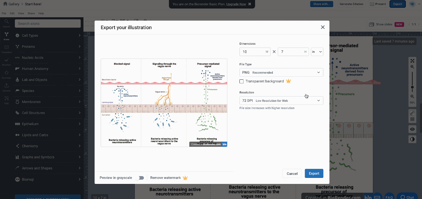 This article will guide you through exporting your illustrations from BioRender, either from the Canvas or your Gallery. It covers how to customize size, resolution, and file format, as well as the available export options for different plans.