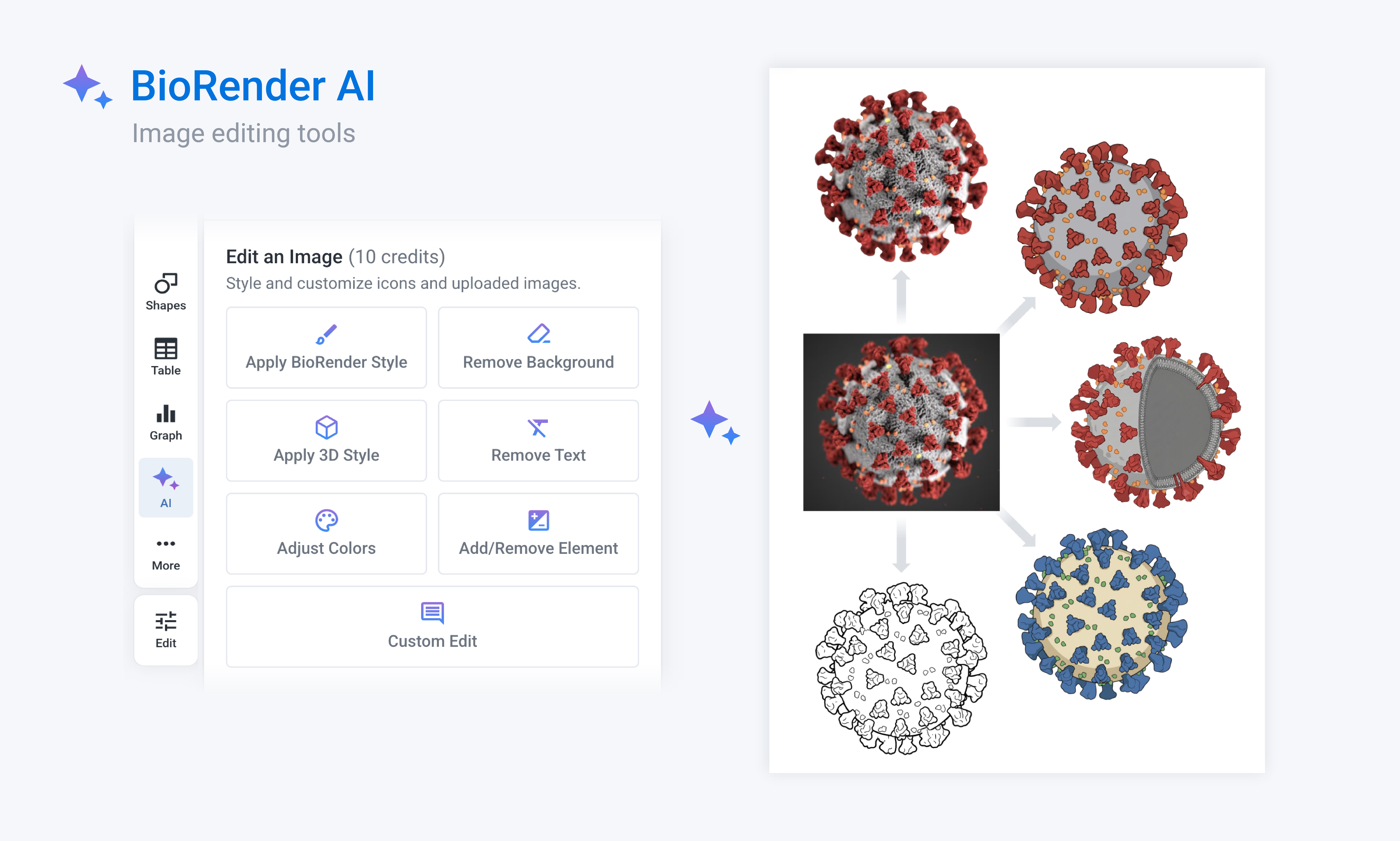 BioRender now supports using AI to modify your uploaded images, and BioRender icons too! You can change the style, remove text and backgrounds, adjust colours, add/remove details, and make custom edits with a quick text prompt. These features will help you bridge the gap between available BioRender icons and the specific images that you need for your illustration.