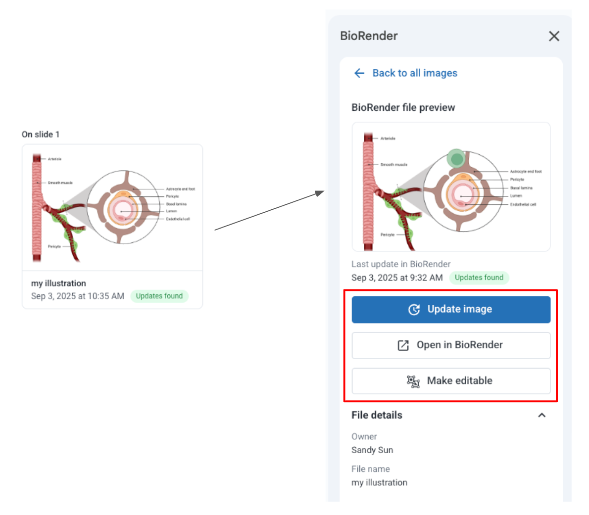 - Auto-update supported: If the illustration is updated in BioRender, you’ll see the option in Google Slides to apply the latest version and replace the existing image