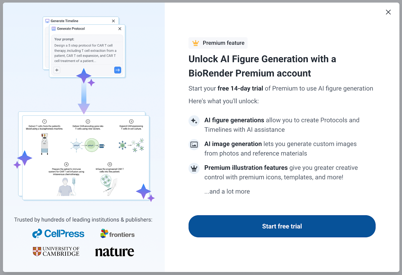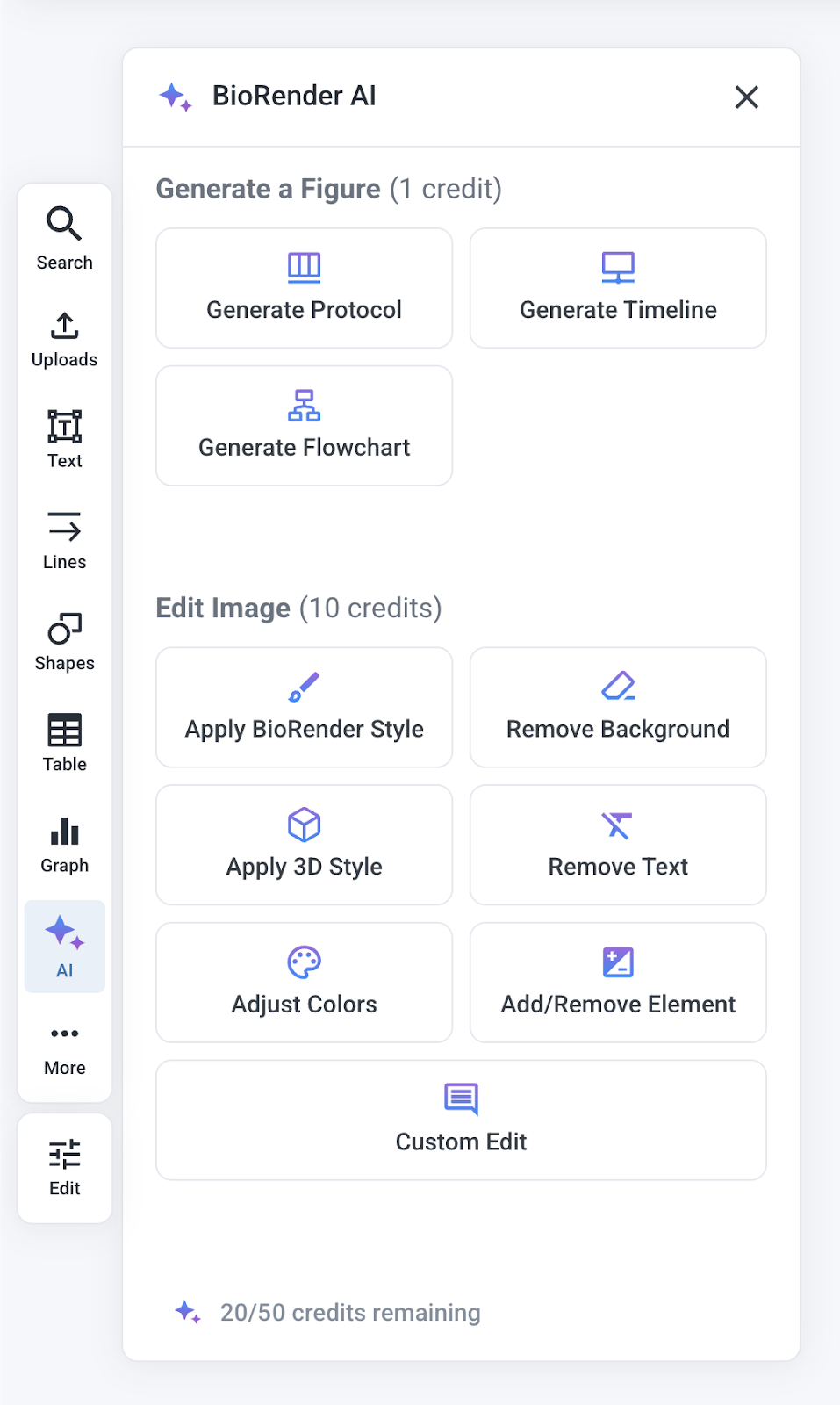 Unlock powerful AI tools in BioRender to generate figure drafts, modify images, and stylize content with ease using AI credits. This add-on gives you expanded access to our suite of AI-powered tools and provides flexible monthly credit options for enhanced figure generation, AI-powered image editing, and stylization.