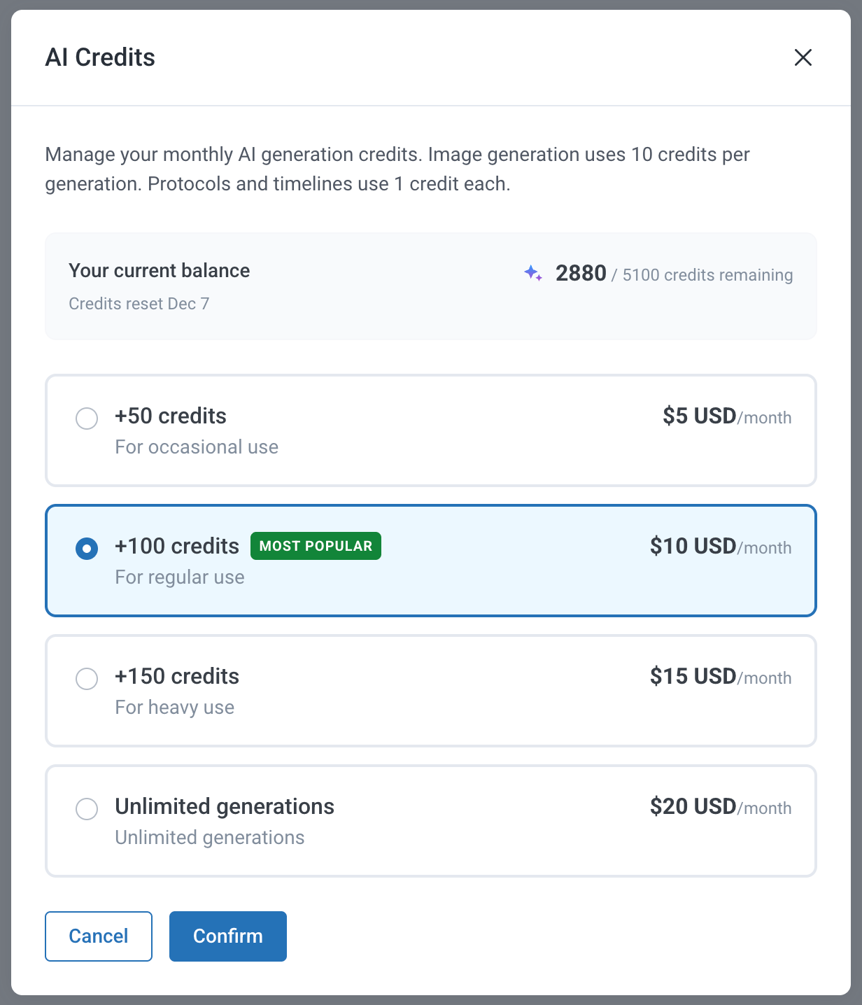 - Individual & Team subscriptions: Eligible to purchase the AI Add-On directly. You can choose from flexible monthly plans based on your AI usage needs.