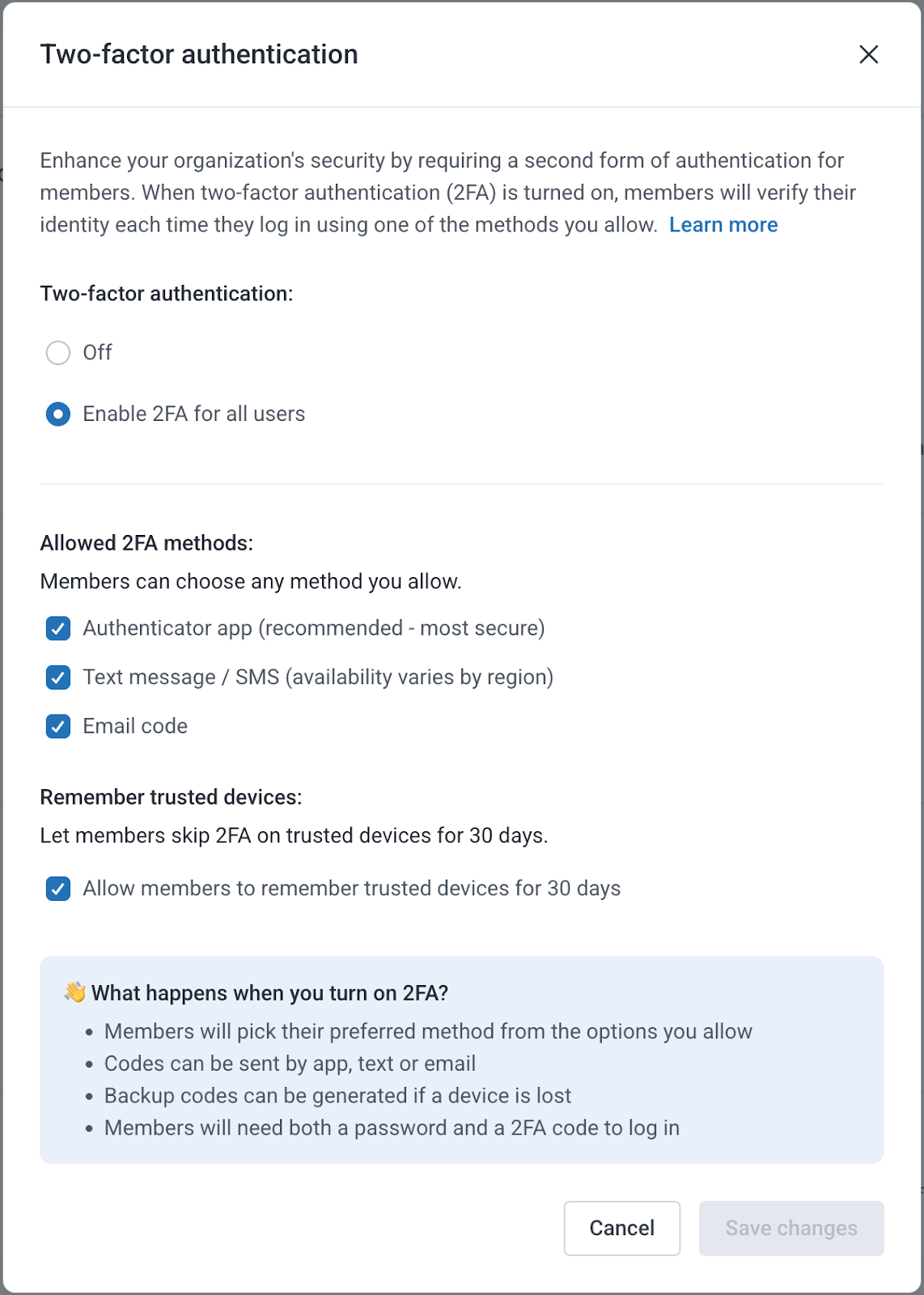 Admins can also change allowed methods anytime before enforcement. Members will be prompted to set up 2FA the next time they log in after it's enabled.