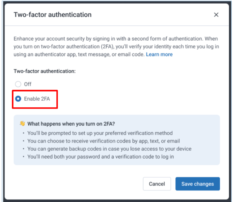 Admins can enable 2FA early and choose which authentication methods are available to their team. If no action is taken, 2FA will automatically be enabled on the enforcement date.